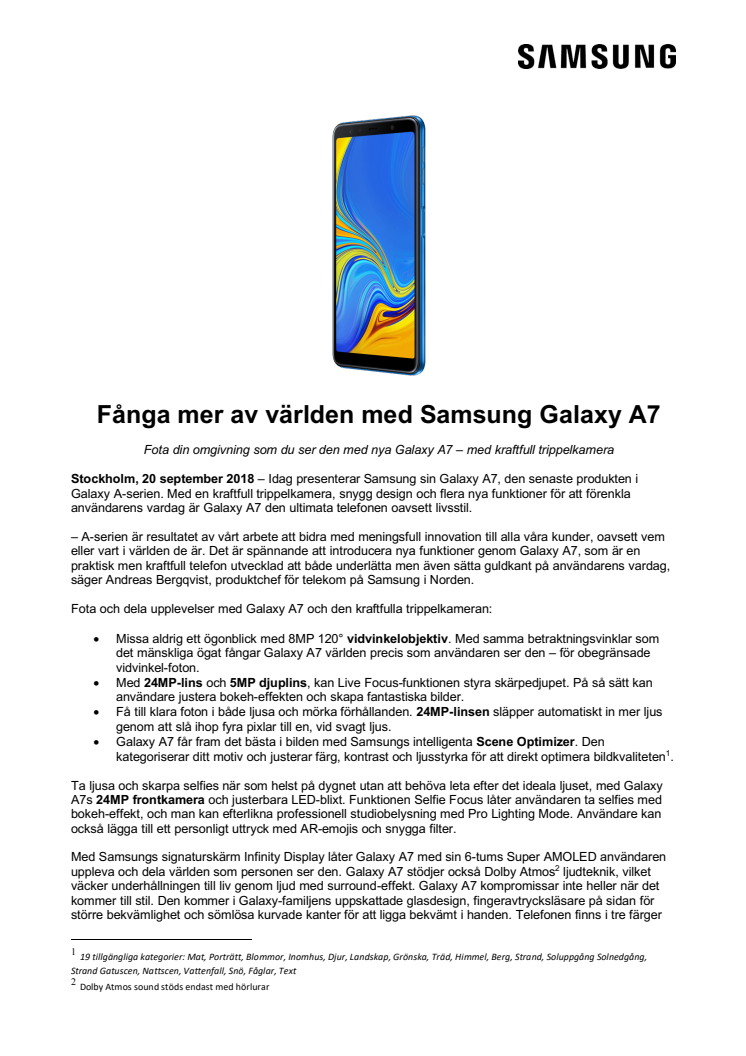Idag presenterar Samsung sin Galaxy A7, den senaste produkten i Galaxy A-serien. Med en kraftfull trippelkamera, snygg design och flera nya funktioner för att förenkla användarens vardag är Galaxy A7 den ultimata telefonen oavsett livsstil.