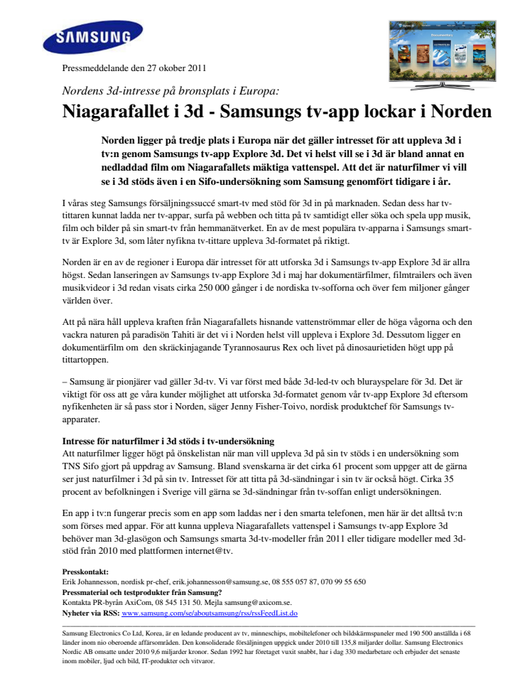 Norden ligger på tredje plats i Europa när det gäller intresset för att uppleva 3d i tv:n genom Samsungs tv-app Explore 3d. Det vi helst vill se i 3d är bland annat en nedladdad film om Niagarafallets mäktiga vattenspel. Att det är naturfilmer vi vill se i 3d stöds även i en Sifo-undersökning som Samsung genomfört tidigare i år.