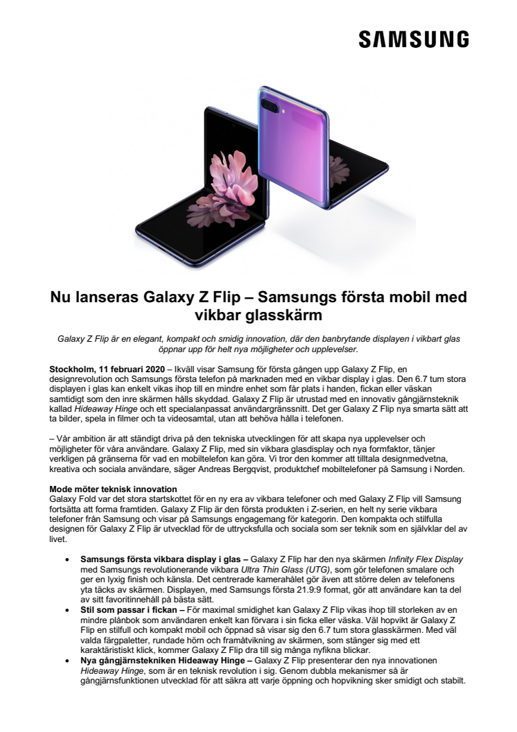 Nu lanseras Galaxy Z Flip – Samsungs första mobil med vikbar glasskärm