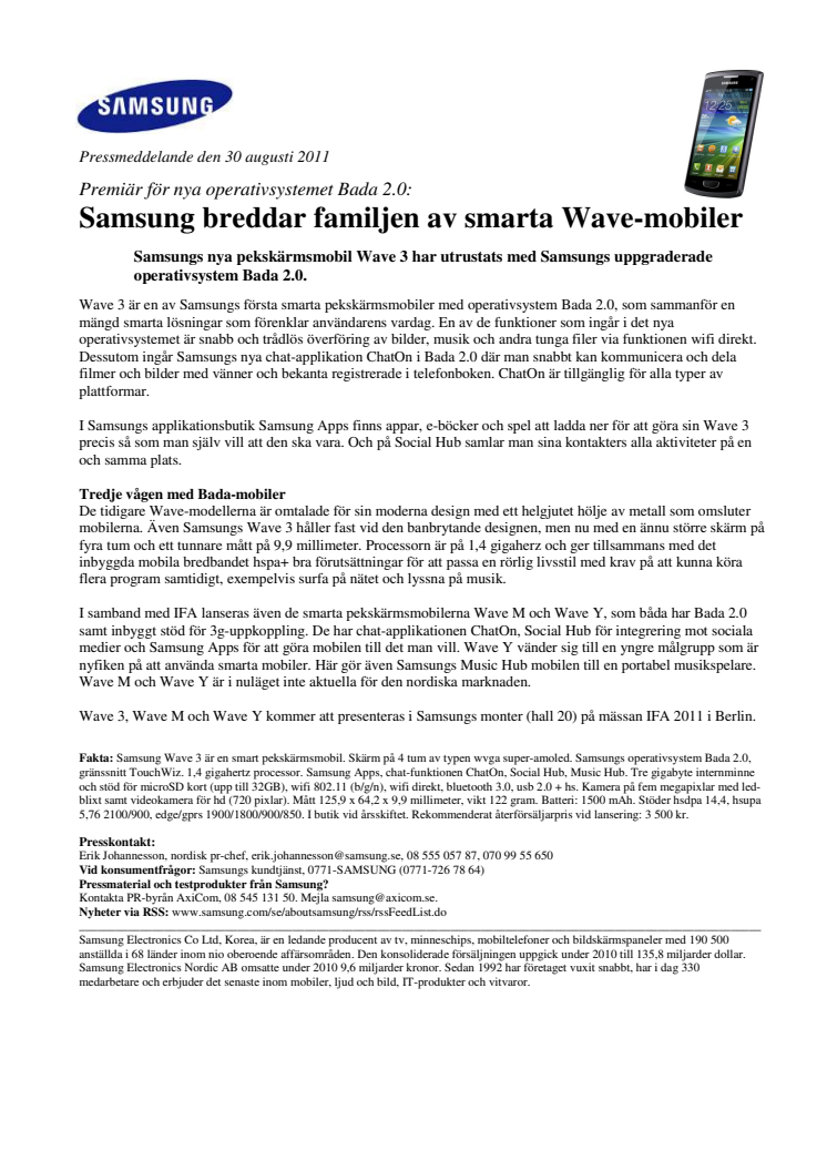 Samsungs nya pekskärmsmobil Wave 3 har utrustats med Samsungs uppgraderade operativsystem Bada 2.0.