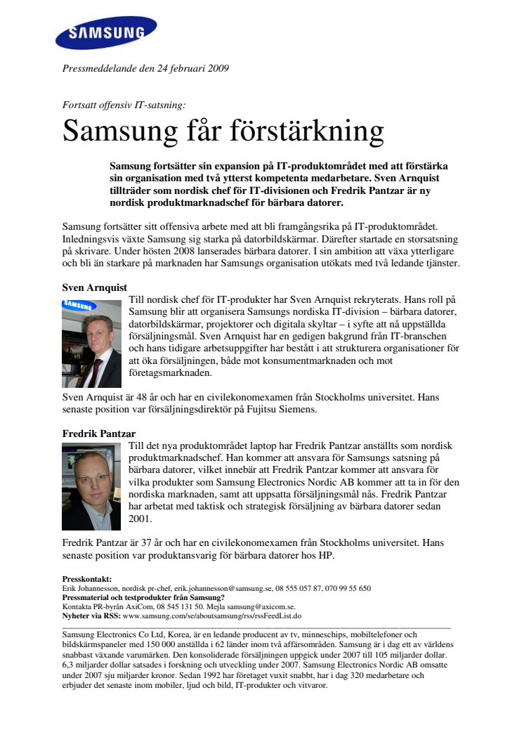 Samsung fortsätter sin expansion på IT-produktområdet med att förstärka sin organisation med två ytterst kompetenta medarbetare. Sven Arnquist tillträder som nordisk chef för IT-divisionen och Fredrik Pantzar är ny nordisk produktmarknadschef för bärbara datorer.