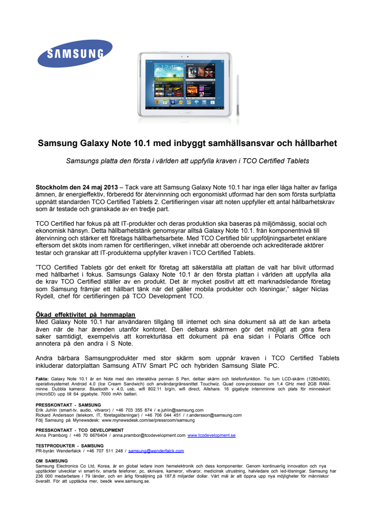 Samsungs platta den första i världen att uppfylla kraven i TCO Certified Tablets. Tack vare att Samsung Galaxy Note 10.1 har inga eller låga halter av farliga ämnen, är energieffektiv, förberedd för återvinnning och ergonomiskt utformad har den som första surfplatta uppnått standarden TCO Certified Tablets 2.
