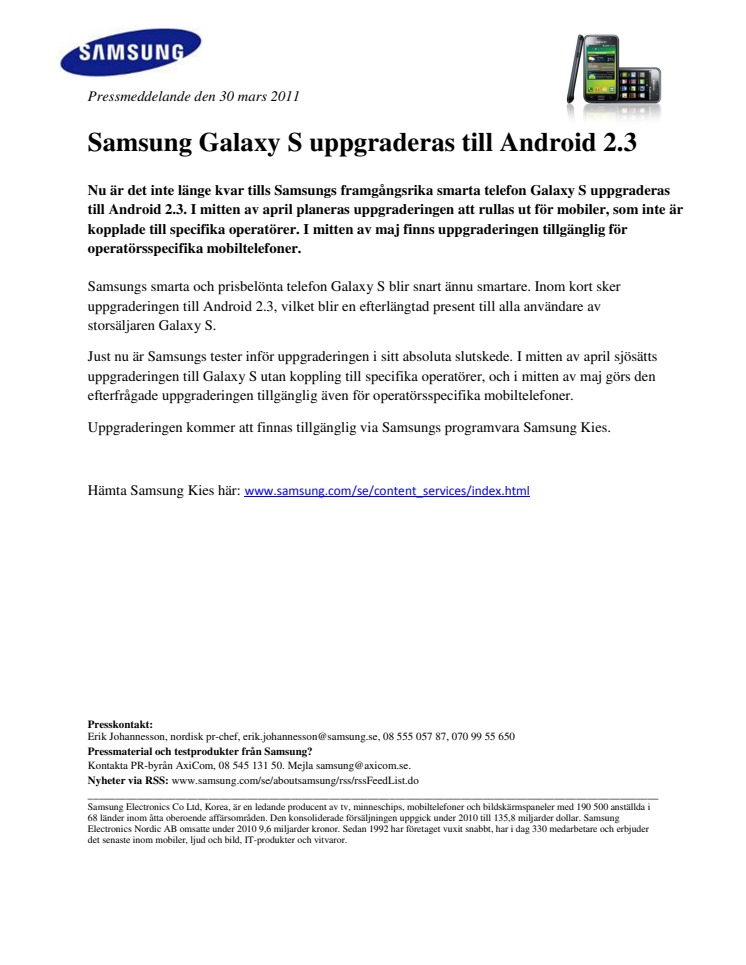 Nu är det inte länge kvar tills Samsungs framgångsrika smarta telefon Galaxy S uppgraderas till Android 2.3. I mitten av april planeras uppgraderingen att rullas ut för mobiler, som inte är kopplade till specifika operatörer. I mitten av maj finns uppgraderingen tillgänglig för operatörsspecifika mobiltelefoner.