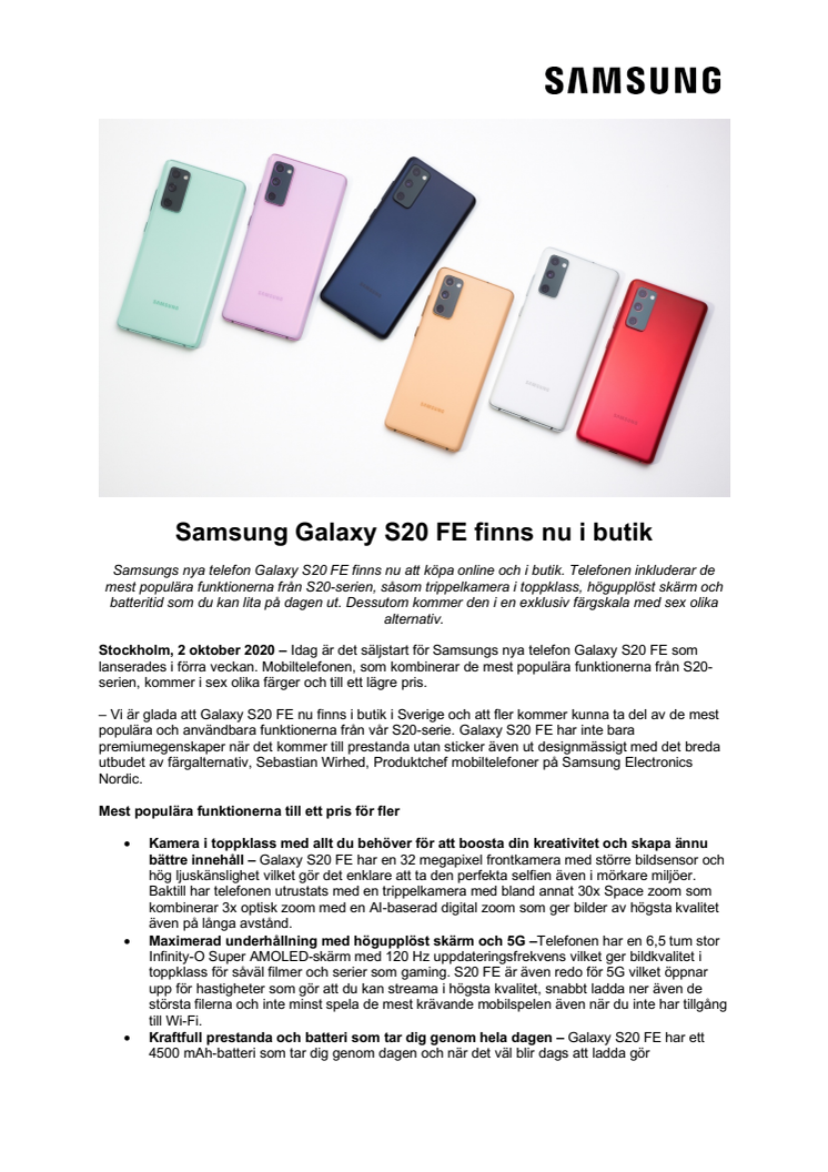 Samsungs nya telefon Galaxy S20 FE finns nu att köpa online och i butik. Telefonen inkluderar de mest populära funktionerna från S20-serien, såsom trippelkamera i toppklass, högupplöst skärm och batteritid som du kan lita på dagen ut. Dessutom kommer den i en exklusiv färgskala med sex olika alternativ.