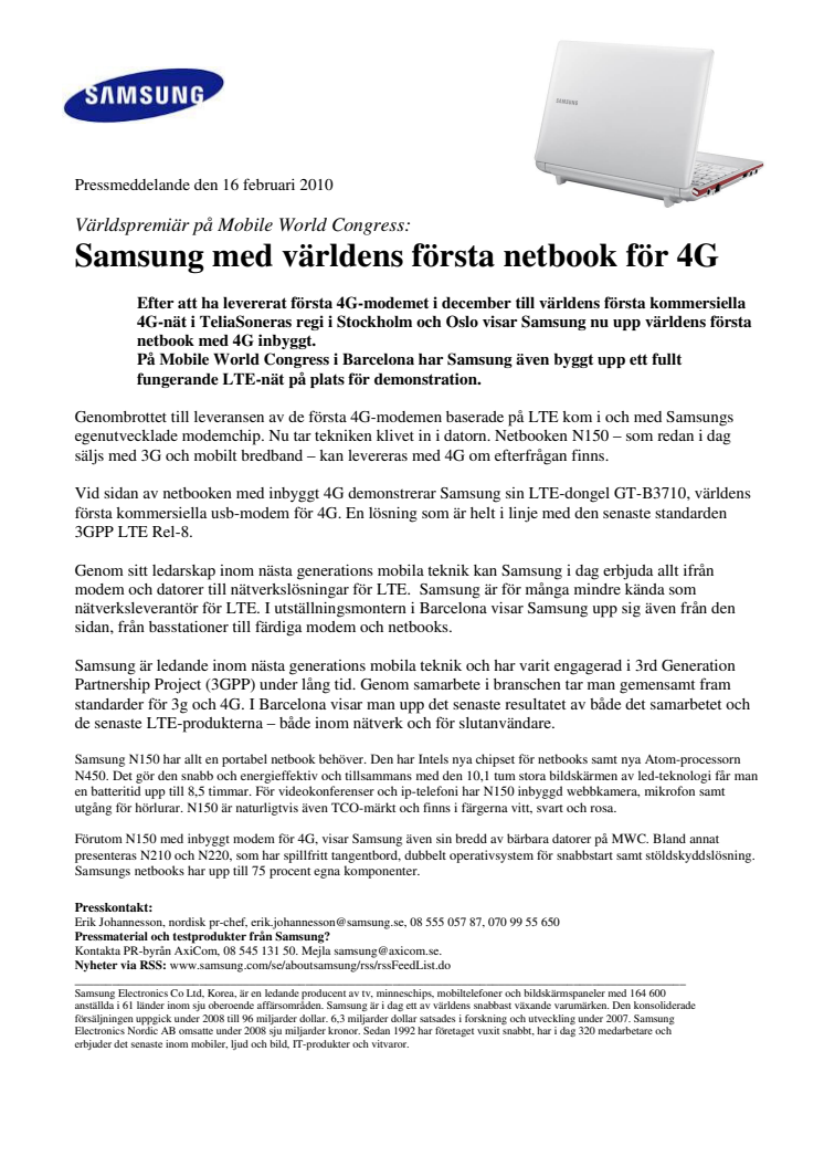 Efter att ha levererat första 4G-modemet i december till världens första kommersiella 4G-nät i TeliaSoneras regi i Stockholm och Oslo visar Samsung nu upp världens första netbook med 4G inbyggt.
