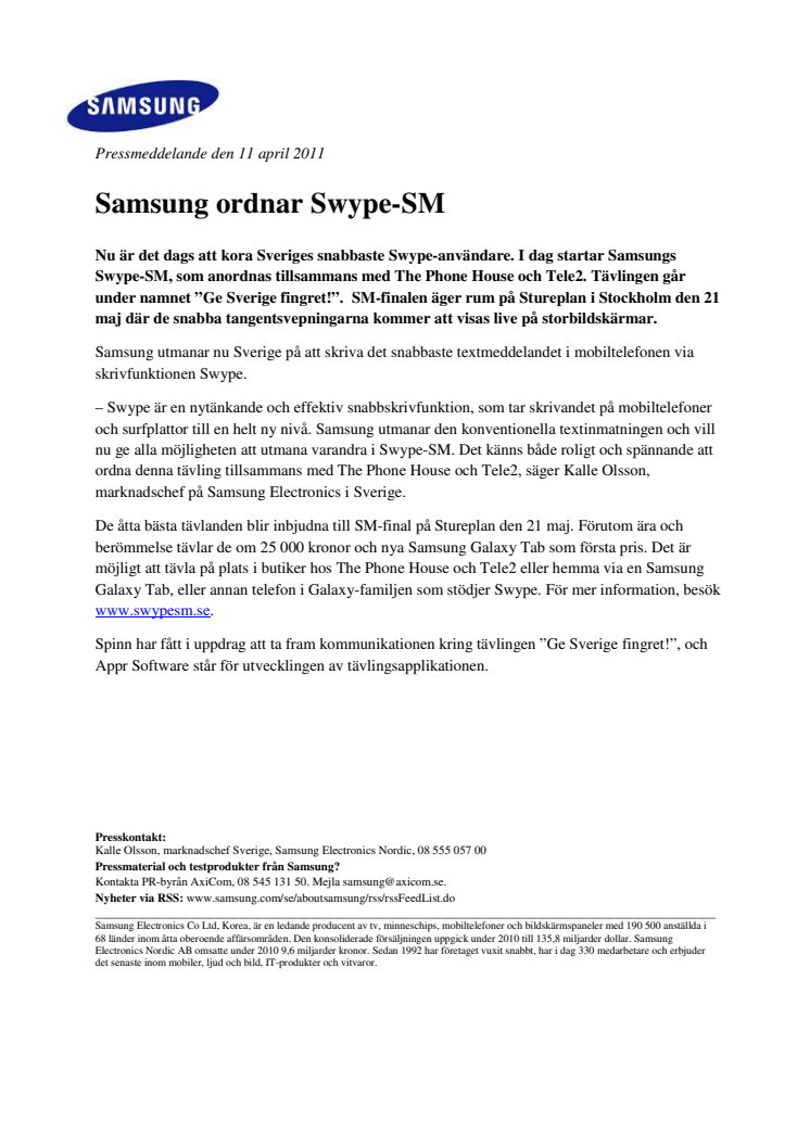 Nu är det dags att kora Sveriges snabbaste Swype-användare. I dag startar Samsungs Swype-SM, som anordnas tillsammans med The Phone House och Tele2. Tävlingen går under namnet ”Ge Sverige fingret!”. SM-finalen äger rum på Stureplan i Stockholm den 21 maj där de snabba tangentsvepningarna kommer att visas live på storbildskärmar.