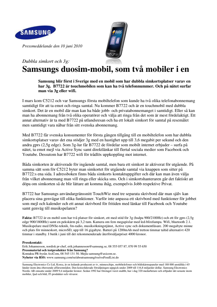 Samsung blir först i Sverige med en mobil som har dubbla simkortsplatser varav en har 3g. B7722 är touchmobilen som kan ha två telefonnummer. Och på nätet surfar man via 3g eller wifi.
