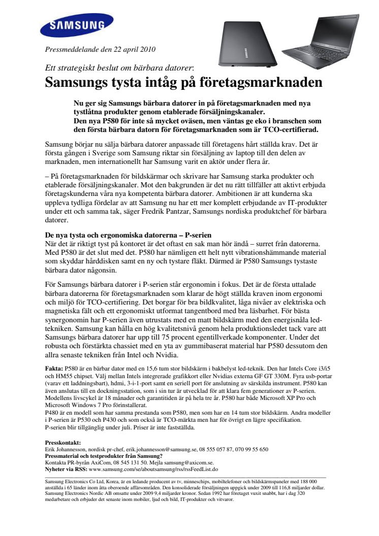 Den nya P580 för inte så mycket oväsen, men väntas ge eko i branschen som den första bärbara datorn för företagsmarknaden som är TCO-certifierad.