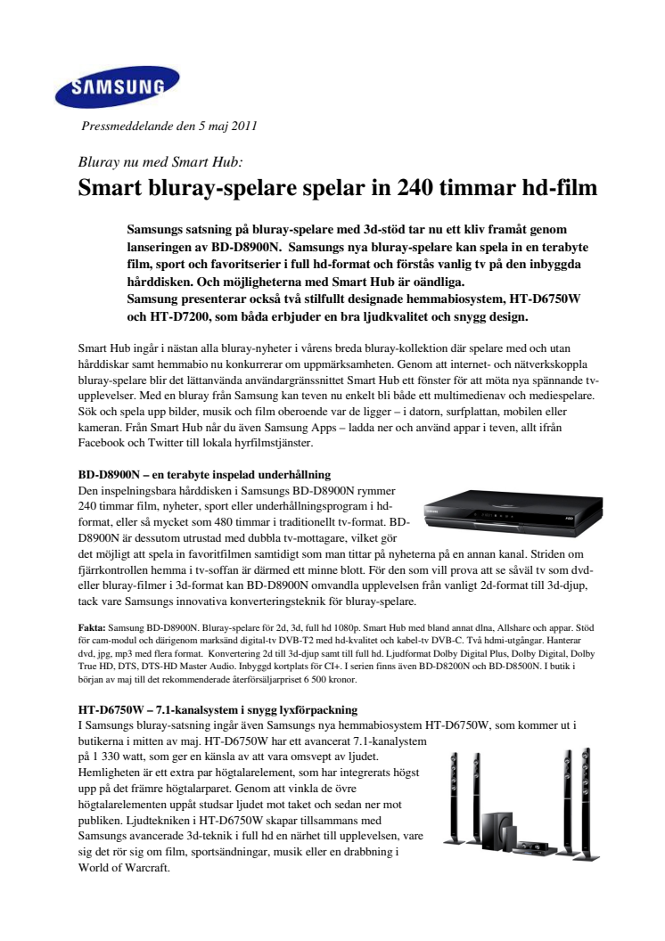 Samsungs satsning på bluray-spelare med 3d-stöd tar nu ett kliv framåt genom lanseringen av BD-D8900N. Samsungs nya bluray-spelare kan spela in en terabyte film, sport och favoritserier i full hd-format och förstås vanlig tv på den inbyggda hårddisken. Och möjligheterna med Smart Hub är oändliga.