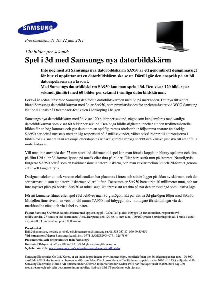 Med Samsungs datorbildskärm SA950 kan man spela i 3d. Den visar 120 bilder per sekund, jämfört med 60 bilder per sekund i vanliga datorbildskärmar.
