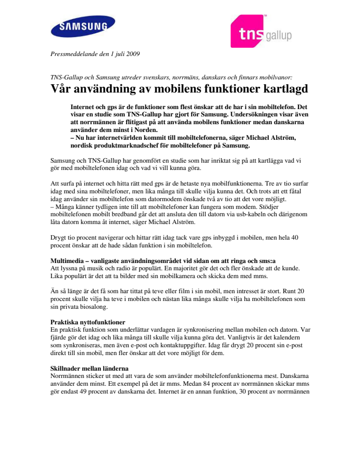 Internet och gps är de funktioner som flest önskar att de har i sin mobiltelefon. Det visar en studie som TNS-Gallup har gjort för Samsung. Undersökningen visar även att norrmännen är flitigast på att använda mobilens funktioner medan danskarna använder dem minst i Norden.