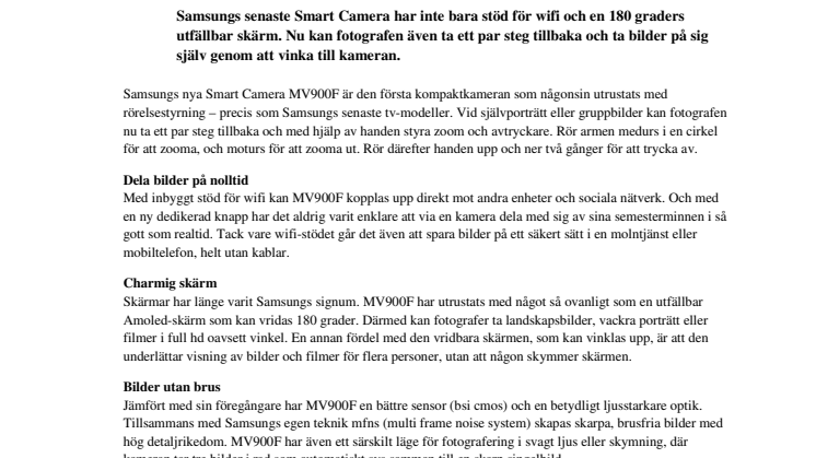 Samsungs nya Smart Camera MV900F är den första kompaktkameran som någonsin utrustats med rörelsestyrning – precis som Samsungs senaste tv-modeller. Vid självporträtt eller gruppbilder kan fotografen nu ta ett par steg tillbaka och med hjälp av handen styra zoom och avtryckare. Rör armen medurs i en cirkel för att zooma, och moturs för att zooma ut. Rör därefter handen upp och ner två gånger för att trycka av.
