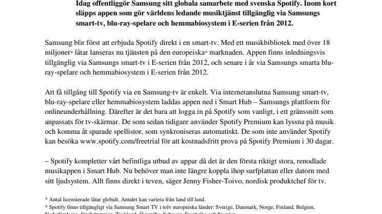 Idag offentliggör Samsung sitt globala samarbete med svenska Spotify. Inom kort släpps appen som gör världens ledande musiktjänst tillgänglig via Samsungs smart-tv, blu-ray-spelare och hemmabiosystem i E-serien från 2012.