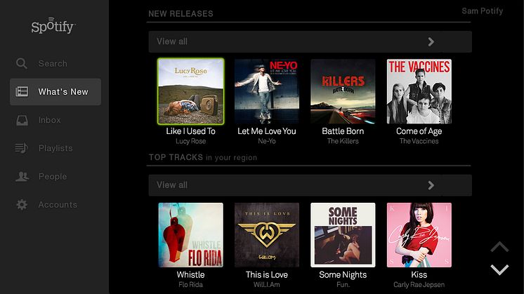 – Spotify kompletter vårt befintliga utbud av appar då det är den första riktigt stora, renodlade musikappen i Smart Hub. Nu behöver man inte längre koppla ihop surfplattan eller datorn med sitt ljudsystem. Allt finns direkt i teven, säger Jenny Fisher-Toivo, nordisk produktchef för tv.