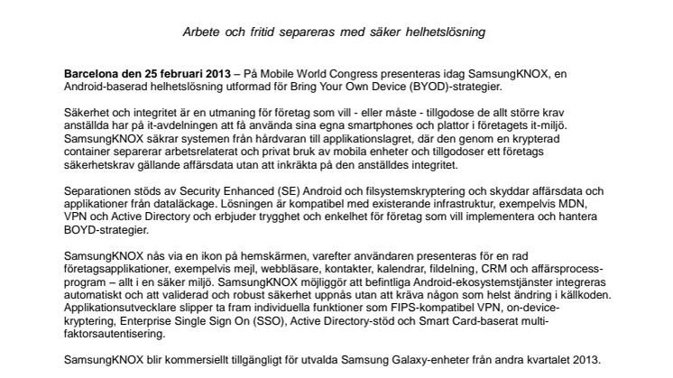 Barcelona den 25 februari 2013 – På Mobile World Congress presenteras idag SamsungKNOX, en Android-baserad helhetslösning utformad för Bring Your Own Device (BYOD)-strategier.