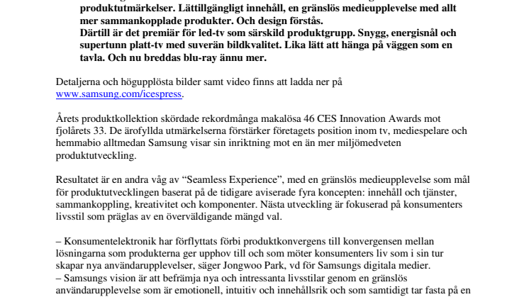 - Konsumentelektronik har förflyttats förbi produktkonvergens till konvergensen mellan lösningarna som produkterna ger upphov till och som möter konsumenters liv som i sin tur skapar nya användarupplevelser, säger Jongwoo Park, vd för Samsungs digitala medier.