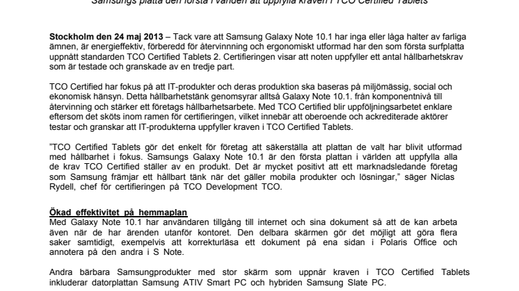 ”TCO Certified Tablets gör det enkelt för företag att säkerställa att plattan de valt har blivit utformad med hållbarhet i fokus. Samsungs Galaxy Note 10.1 är den första plattan i världen att uppfylla alla de krav TCO Certified ställer av en produkt. Det är mycket positivt att ett marknadsledande företag som Samsung främjar ett hållbart tänk när det gäller mobila produkter och lösningar,” säger Niclas Rydell, chef för certifieringen på TCO Development TCO.