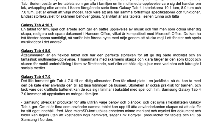 Fakta: De flesta modeller i Galaxy Tab 4-serien är utrustade med en 1.2 GHz Quad Core-processor och WXGA-skärm (1280 X 800). Tab 4 7.0 med 3G/ Wi-Fi har 1.2 GHz Quad Core LTE respektive 1.4 GHz Quad Core. Operativsystem Android 4.4 (KitKat). Alla modeller är utrustade med WiFi 802.11 a/b/g/n , WiFi Direct, BT4.0, USB2.0. RAM-minne på 1.5GB 16GB* internminne + stöd för microSD på upp till 64GB beroende på modell. Batteri på 4,000 mAh – 6,800 mAh beroende på modell. Tab 4 10.1 med eller utan 4g och Tab 4 7.0 med wifi finns i butik i april, Tab 4 8.0 med eller utan 4g och Tab 4 7.0 med 4g kommer i juni. Se bifogat dokument för rekommenderade butikspriser.