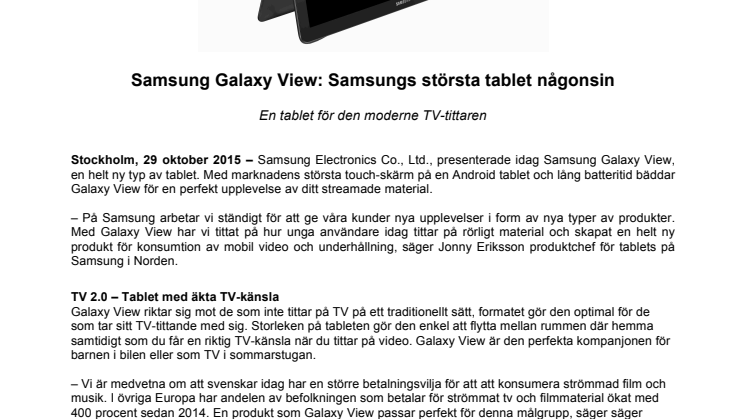Stockholm, 29 oktober 2015 – Samsung Electronics Co., Ltd., presenterade idag Samsung Galaxy View, en helt ny typ av tablet. Med marknadens största touch-skärm på en Android tablet och lång batteritid bäddar Galaxy View för en perfekt upplevelse av ditt streamade material.