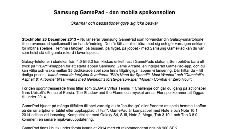 Stockholm 19 December 2013 – Nu lanserar Samsung GamePad som förvandlar din Galaxy-smartphone till en avancerad spelkonsoll i en handvändning. Den är lätt att alltid bära med sig och gör vardagen enklare för inbitna spelare. Hemma i fåtöljen, på bussen, på flyget, på jobbet - med Samsung GamePad kan du var som helst slå ditt gamla rekord i favoritspelet.