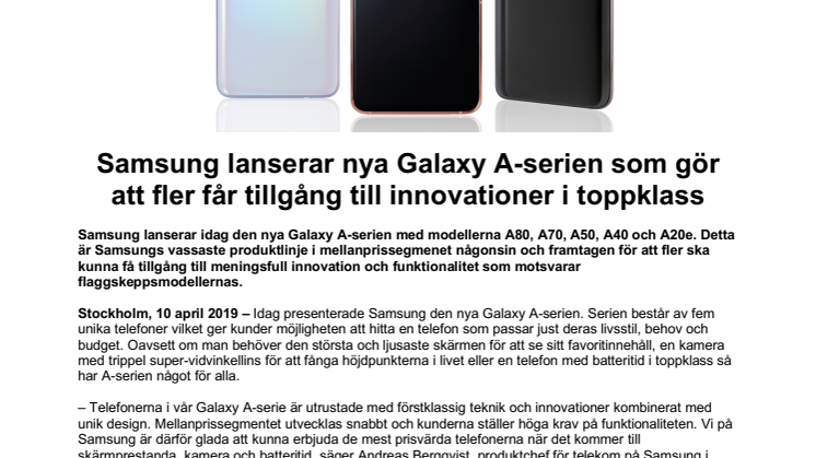 Samsung lanserar idag den nya Galaxy A-serien med modellerna A80, A70, A50, A40 och A20e. Detta är Samsungs vassaste produktlinje i mellanprissegmenet någonsin och framtagen för att fler ska kunna få tillgång till meningsfull innovation och funktionalitet som motsvarar flaggskeppsmodellernas.