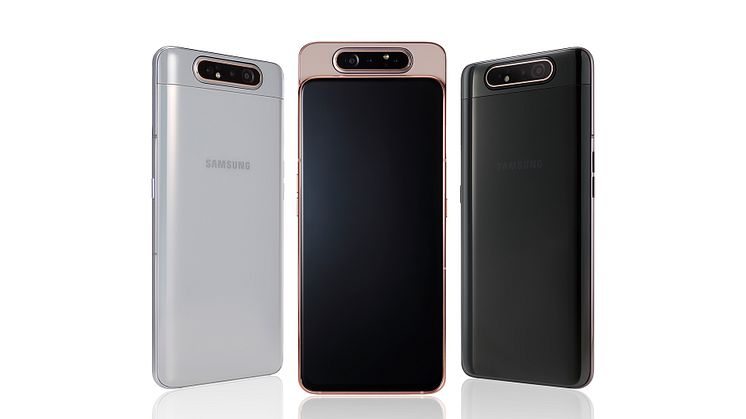 Galaxy A80 samlar alla funktioner med en innovativ, vridbar kamera som ger användare helt nya möjligheter att fotografera och filma. Tre kameror kombineras för att ge användaren nya kreativa möjligheter. Den vridbara kameran skjuts upp bakom skärmen och tar lika bra bilder åt båda hållen, vilket gör att användare inte längre behöver kompromissa det minsta med kvaliteten på sina selfies. Oberoende håll kan man använda huvudkameran på 48MP f2.0, super-vidvinkelkamera och en djupeffektskamera för bokeh-effekt. Användare kan även ta skarpa bilder vid sämre ljus tack vare ett ljusinsläpp på f2.0 och Dual Pixel-teknik. Eftersom kameran inte tar någon plats i displayen får användaren maximal skärmupplevelse där en kraftfull processor och hög batterikapacitet ger smidigare multitasking och bättre spelupplevelser.