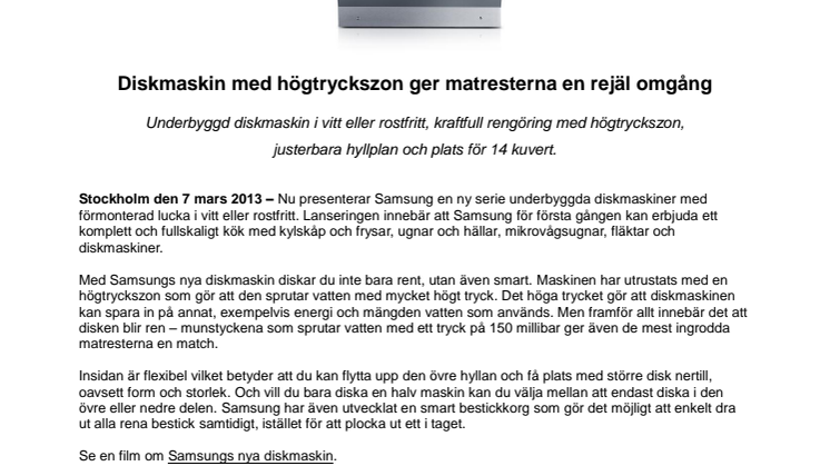 Nu presenterar Samsung en ny serie underbyggda diskmaskiner med förmonterad lucka i vitt eller rostfritt. Lanseringen innebär att Samsung för första gången kan erbjuda ett komplett och fullskaligt kök med kylskåp och frysar, ugnar och hällar, mikrovågsugnar, fläktar och diskmaskiner.