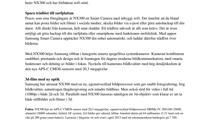 Fakta: NX300 har en APS-C CMOS-sensor med 20,3 megapixlar, egenutvecklad bildprocessor DRIMe IV, ISO100-25600, slutartid 1/6000 sekunder, hybrid AF-system, 8,6 bilder per sekund, tiltbar Amoled-skärm på 84 millimeter (3,31 tum) och en vikt på 280 gram (utan batteri). Lanseras i färgerna vit och svart i april 2013 med ett rekommenderat butikspris på 7 700 kronor, inklusive standardoptik. 3d-objektivet NX 45 mm f1.8 2d/3d lanseras i färgerna vit och svart i april 2013 med ett rekommenderat butikspris på 4 500 kronor.