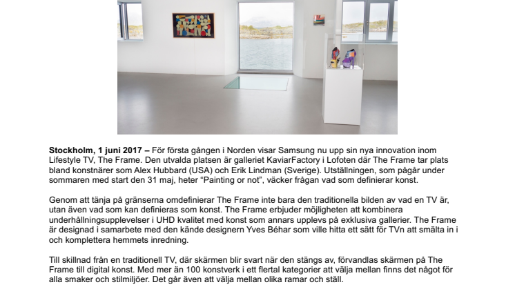 Stockholm, 1 juni 2017 – För första gången i Norden visar Samsung nu upp sin nya innovation inom Lifestyle TV, The Frame. Den utvalda platsen är galleriet KaviarFactory i Lofoten där The Frame tar plats bland konstnärer som Alex Hubbard (USA) och Erik Lindman (Sverige). Utställningen, som pågår under sommaren med start den 31 maj, heter “Painting or not”, väcker frågan vad som definierar konst.