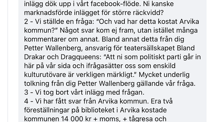 Samtidigt kontaktade Victoria Tiblom, riksdagsledamot för SD och verksam i Skåne län, Arvika kommun och begärde ut uppgifter om teatersällskapets bokning, trots att detta alltså gäller en helt annan del av landet. Detta agerande bryter mot principen om armlängds avstånd mellan politik och kultur, en princip som det råder politisk enighet om i Sverige.