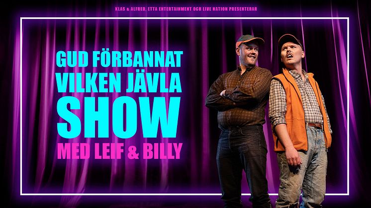“Gud förbannat vilken jävla SHOW! Med Leif & Billy” är en kaotisk humorföreställning, helt i brödernas egna, urflippade, stökiga värld - fylld med roliga sketcher, sånger, och igenkänning för fansen - men också mer otippat känslosamma delar. Allt av och med Sörbäckens mest dynamiska brödraduo. Det kan bli trolleri, det kan bli teater, det kan bli bråk, det kan bli kärlek. Men framför allt blir det Leif & Billy. Gud förbannat, det här får ni inte missa! Premiär på Scalateatern i Stockholm den 28 september. Biljettsläpp onsdagen den 5 april kl. 10:00 via leifochbilly.se