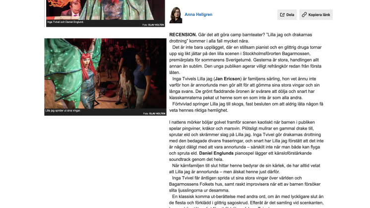 Idag startar turnén ute i landets Folkets Hus och Parker för Bland drakar och dragqueens nya musikal ”Lilla Jag och Drakarnas drottning”. Musikalen är en unik blandning mellan glamourös dragshow, levande musik och barnteater. Närmast väntar en föreställning på Bohus-Malmön, därefter fortsätter resan vidare till Jönköping, Eskilstuna, Örebro, Tumba, Hargshamn, Gävle, Falun, Borlänge, Kävlinge, Lund, Malmö, Lomma, Vetlanda och Nävekvarn. Biljetter via www.folketshusochparker.se/lilla-jag-och-drakarnas-drottning