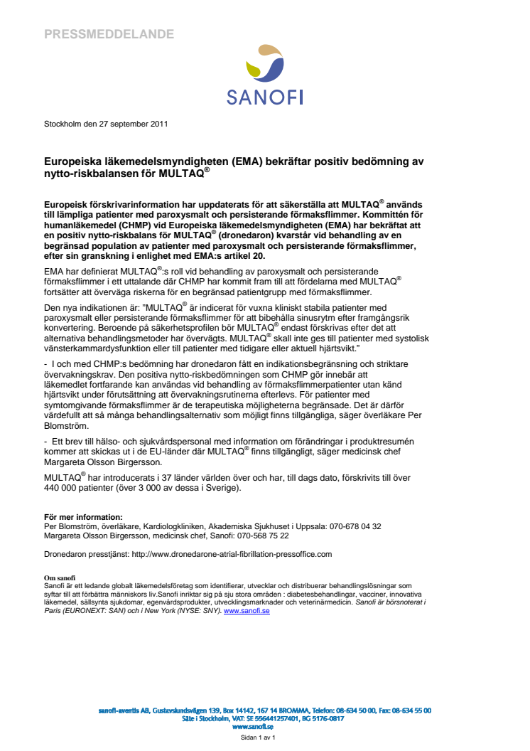 Europeiska läkemedelsmyndigheten (EMA) bekräftar positiv bedömning av nytto-riskbalansen för MULTAQ®