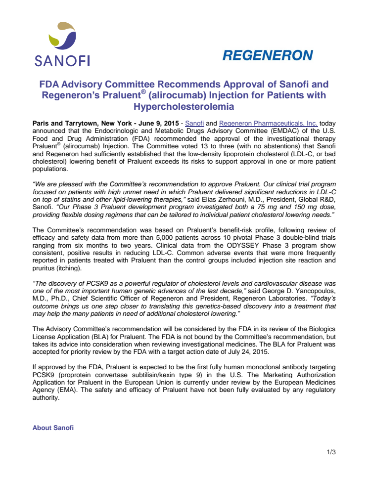 Paris and Tarrytown, New York - June 9, 2015 - Sanofi and Regeneron Pharmaceuticals, Inc. today announced that the Endocrinologic and Metabolic Drugs Advisory Committee (EMDAC) of the U.S. Food and Drug Administration (FDA) recommended the approval of the investigational therapy Praluent ® (alirocumab) Injection.