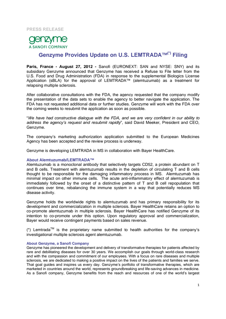 Paris, France - August 27, 2012 - Sanofi (EURONEXT: SAN and NYSE: SNY) and its subsidiary Genzyme announced that Genzyme has received a Refuse to File letter from the U.S. Food and Drug Administration (FDA) in response to the supplemental Biologics License Application (sBLA) for the approval of LEMTRADA™ (alemtuzumab) as a treatment for relapsing multiple sclerosis.