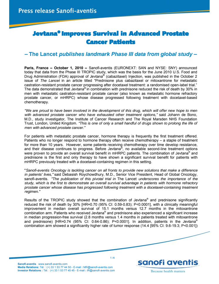 Sanofi-aventis announced today that data from the Phase III TROPIC study, which was the basis for the June 2010 U.S. Food and Drug Administration (FDA) approval of Jevtana® (cabazitaxel) Injection, was published in the October 2 issue of The Lancet.