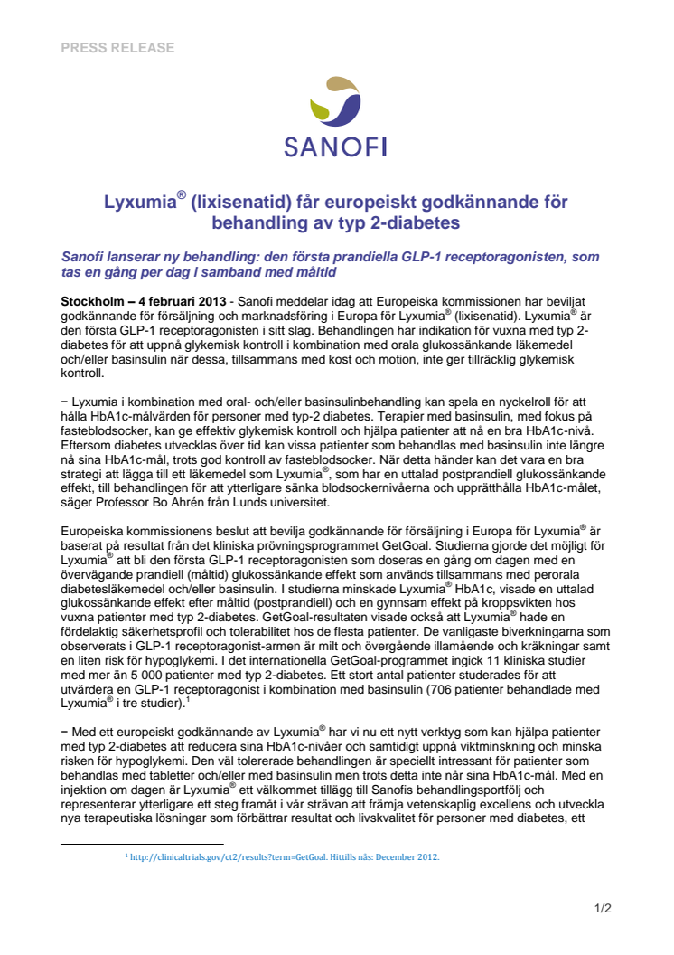 Lyxumia® (lixisenatid) får europeiskt godkännande för behandling av typ 2-diabetes