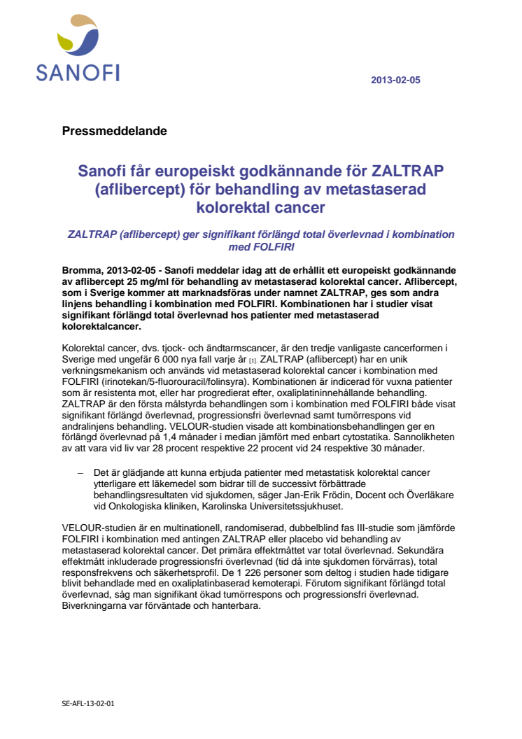 Sanofi meddelar idag att de erhållit ett europeiskt godkännande av aflibercept 25 mg/ml för behandling av metastaserad kolorektal cancer. Aflibercept, som i Sverige kommer att marknadsföras under namnet ZALTRAP, ges som andra linjens behandling i kombination med FOLFIRI. Kombinationen har i studier visat signifikant förlängd total överlevnad hos patienter med metastaserad kolorektalcancer.