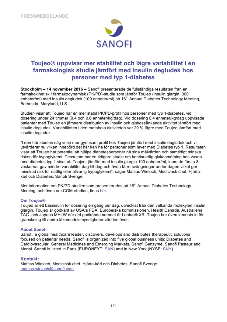 Sanofi presenterade de fullständiga resultaten från en farmakokinetisk / farmakodynamisk (PK/PD)-studie som jämför Toujeo (insulin glargin, 300 enheter/ml) med insulin degludek (100 enheter/ml) på 16th Annual Diabetes Technology Meeting i USA. Studien visar att Toujeo har en mer stabil PK/PD-profil hos personer med typ 1-diabetes, vid dosering under 24 timmar (0,4 och 0,6 enheter/kg/dag).