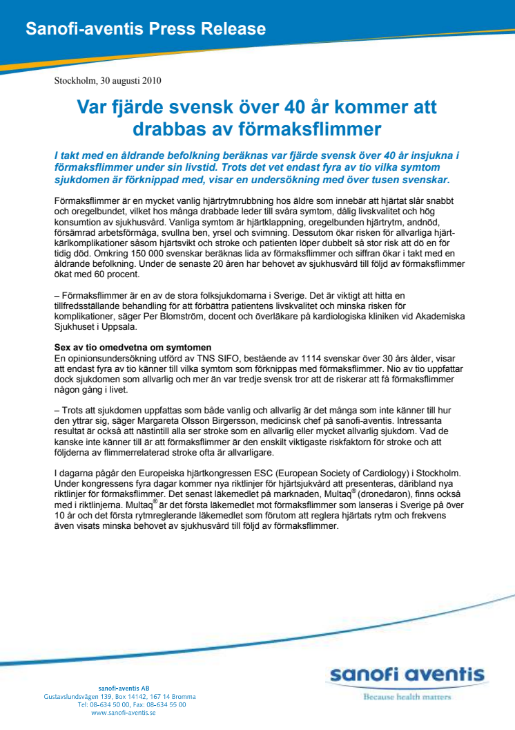 Förmaksflimmer är en hjärtrytmrubbning som blir allt vanligare i takt med att befolkningen blir äldre. En av fyra svenskar över 40 år beräknas insjukna under sin livstid. Ändå är de flesta omedvetna om vilka symtom sjukdomen är förknippad med, visar en opinionsundersökning.