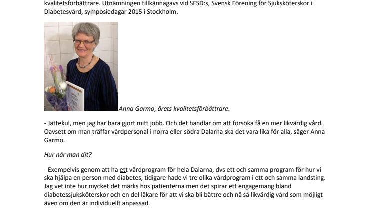 Bland landets diabetessjuksköterskor har Anna Garmo, Dalarnas Diabetesråd, utsetts till Årets kvalitetsförbättrare. Utnämningen tillkännagavs vid SFSD:s, Svensk Förening för Sjuksköterskor i Diabetesvård, symposiedagar 2015 i Stockholm.