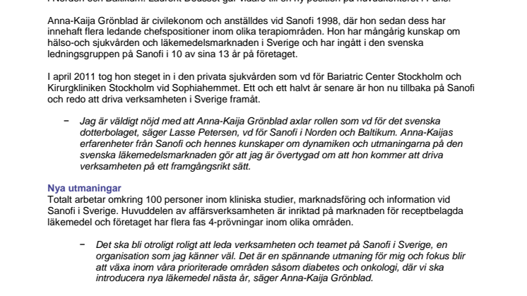 − Jag är väldigt nöjd med att Anna-Kaija Grönblad axlar rollen som vd för det svenska dotterbolaget, säger Lasse Petersen, vd för Sanofi i Norden och Baltikum. Anna-Kaijas erfarenheter från Sanofi och hennes kunskaper om dynamiken och utmaningarna på den svenska läkemedelsmarknaden gör att jag är övertygad om att hon kommer att driva verksamheten på ett framgångsrikt sätt.
