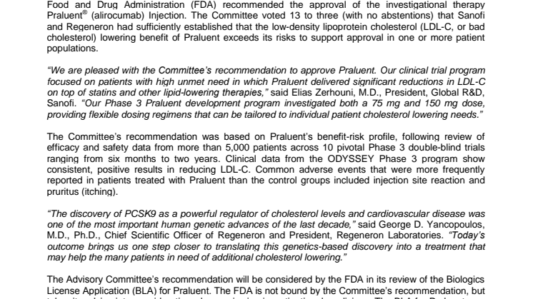 FDA Advisory Committee Recommends Approval of Sanofi and Regeneron’s Praluent ® (alirocumab) Injection for Patients with Hypercholesterolemia