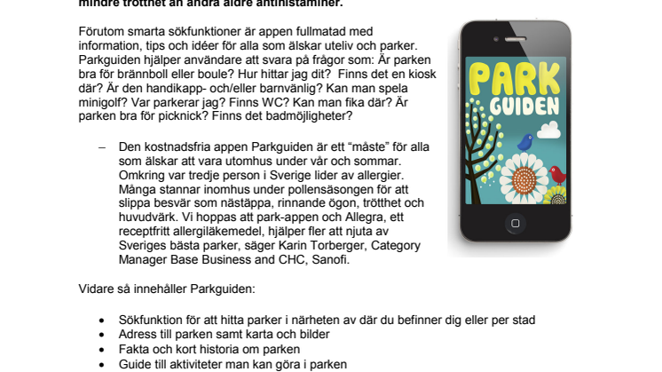 Idag lanseras Parkguiden – en ny gratisapp för iPhone, Android och surfplattor som guidar besökare till parker runt om i Sverige. Via appen får användare tips och aktuell information om en mängd parker. Dessutom finns en pollenprognos-funktion. Då allergisäsongen ibland sätter krokben för parkbesök finns även funktionen ”sök närmsta apotek”. Parkguiden lanseras av Sanofi med Allegra (fexofenadin), ett receptfritt allergiläkemedel. Allegra har en påbörjad effekt inom en timme och ger mindre trötthet än andra äldre antihistaminer.