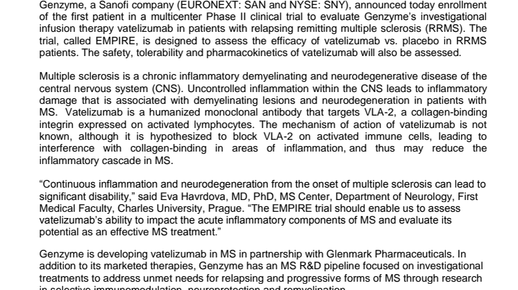 Genzyme, a Sanofi company (EURONEXT: SAN and NYSE: SNY), announced today enrollment of the first patient in a multicenter Phase II clinical trial to evaluate Genzyme’s investigational infusion therapy vatelizumab in patients with relapsing remitting multiple sclerosis (RRMS). The trial, called EMPIRE, is designed to assess the efficacy of vatelizumab vs. placebo in RRMS patients. The safety, tolerability and pharmacokinetics of vatelizumab will also be assessed.