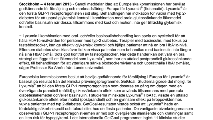 Stockholm – 4 februari 2013 - Sanofi meddelar idag att Europeiska kommissionen har beviljat godkännande för försäljning och marknadsföring i Europa för Lyxumia® (lixisenatid). Lyxumia® är den första GLP-1 receptoragonisten i sitt slag. Behandlingen har indikation för vuxna med typ 2-diabetes för att uppnå glykemisk kontroll i kombination med orala glukossänkande läkemedel och/eller basinsulin när dessa, tillsammans med kost och motion, inte ger tillräcklig glykemisk kontroll.