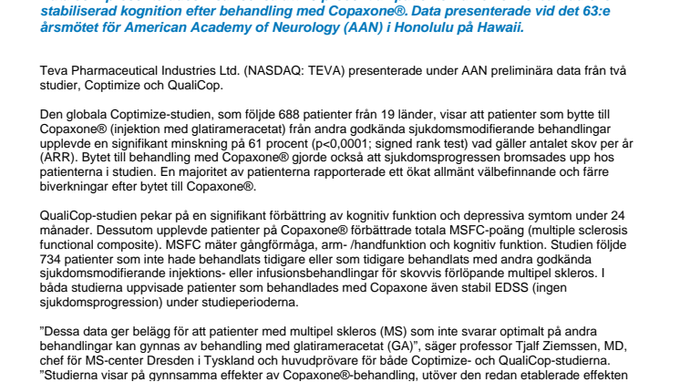Data som presenterades visar också att 70 procent av patienterna fick en förbättrad eller stabiliserad kognition efter behandling med Copaxone®. Data presenterade vid det 63:e årsmötet för American Academy of Neurology (AAN) i Honolulu på Hawaii.