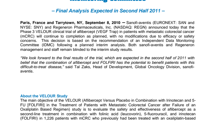 Paris, France and Tarrytown, NY, September 8, 2010 – Sanofi-aventis (EURONEXT: SAN and NYSE: SNY) and Regeneron Pharmaceuticals, Inc. (NASDAQ: REGN) announced today that the Phase 3 VELOUR clinical trial of aflibercept (VEGF Trap) in patients with metastatic colorectal cancer (mCRC) will continue to completion as planned, with no modifications due to efficacy or safety concerns. This decision is based on the recommendation of an Independent Data Monitoring Committee (IDMC) following a planned interim analysis. Both sanofi-aventis and Regeneron management and staff remain blinded to the interim study results.