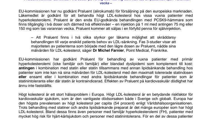 EU-kommissionen har nu godkänt Praluent (alirokumab) för försäljning på den europeiska marknaden. Läkemedlet är godkänt för att behandla högt LDL-kolesterol hos vissa vuxna patienter med hyperkolesterolemi. Praluent är den enda EU-godkända behandlingen med PCSK9-hämmare som finns tillgänglig i två doser och därmed två effektnivåer – en injektion på 1 ml med antingen 75 mg eller 150 mg som tas varannan vecka. Praluent kommer att säljas i en förfylld penna för självinjektion.