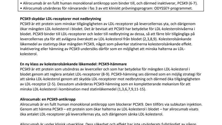 Trots behandling med befintliga kolesterolsänkande läkemedel uppskattas att 66 procent av alla vuxna i USA inte uppnår sina målvärden för LDL-kolesterol (18). I Sverige är motsvarande andel 69 procent ett år efter en hjärtinfarkt (19). Det finns därför ett stort behov av en mer effektiv kolesterolsänkande behandling till högriskpatienter med otillräckligt kontrollerade LDL-kolesterolvärden (10, 16-17). Ett godkännande av alirocumab för klinisk användning kommer att ge ett viktigt tillskott till behandlingsmöjligheterna av patienter med hög kardiovaskulär risk i behov av ytterligare LDL-kolesterolsänkning. Introduktionen av alirocumab kan, för första gången på 30 år, sedan statinernas introduktion, leda till att patienter som inte når målnivåer med den idag bästa primär- och sekundärpreventiva behandlingen erbjuds ytterligare behandling. För den enskilda patienten har det nya preparatet också en viktig betydelse med större möjligheter till LDL-sänkning och måluppfyllelse än tidigare, och i och med det en möjligt minskad risk för framtida allvarliga hjärt-kärlhändelser, säger Emil Hagström, forskare vid Uppsala kliniska forskningscentrum, Uppsala universitet, samt nationell prövningsledare för fas 3-studien, ODYSSEY outcomes, där över 130 svenska patienter för närvarande deltar.